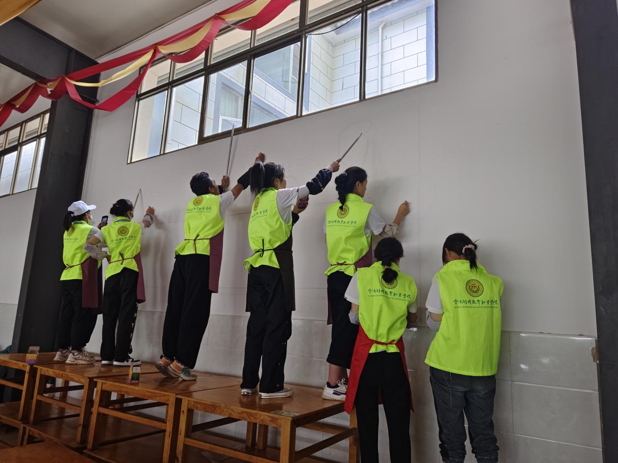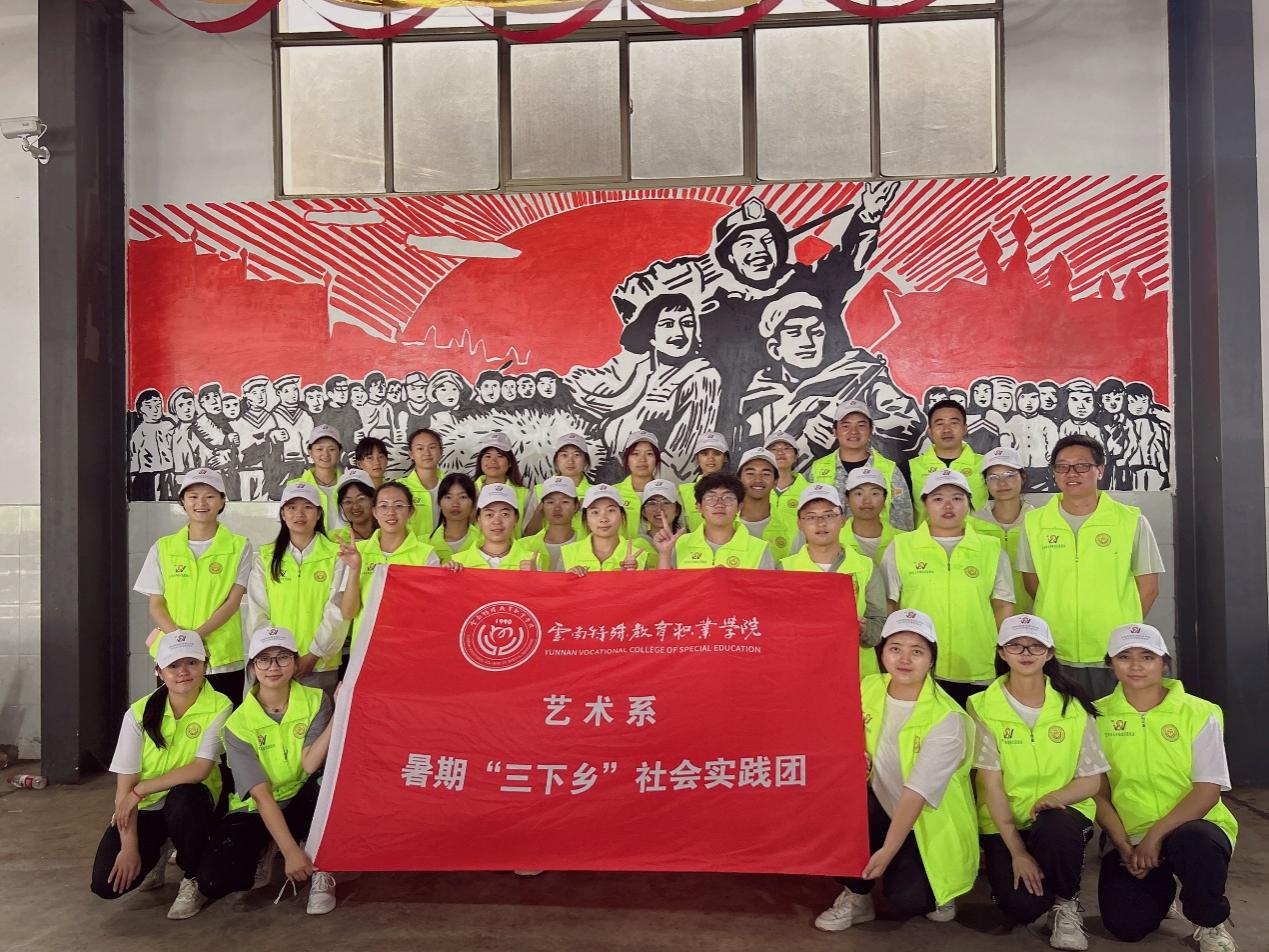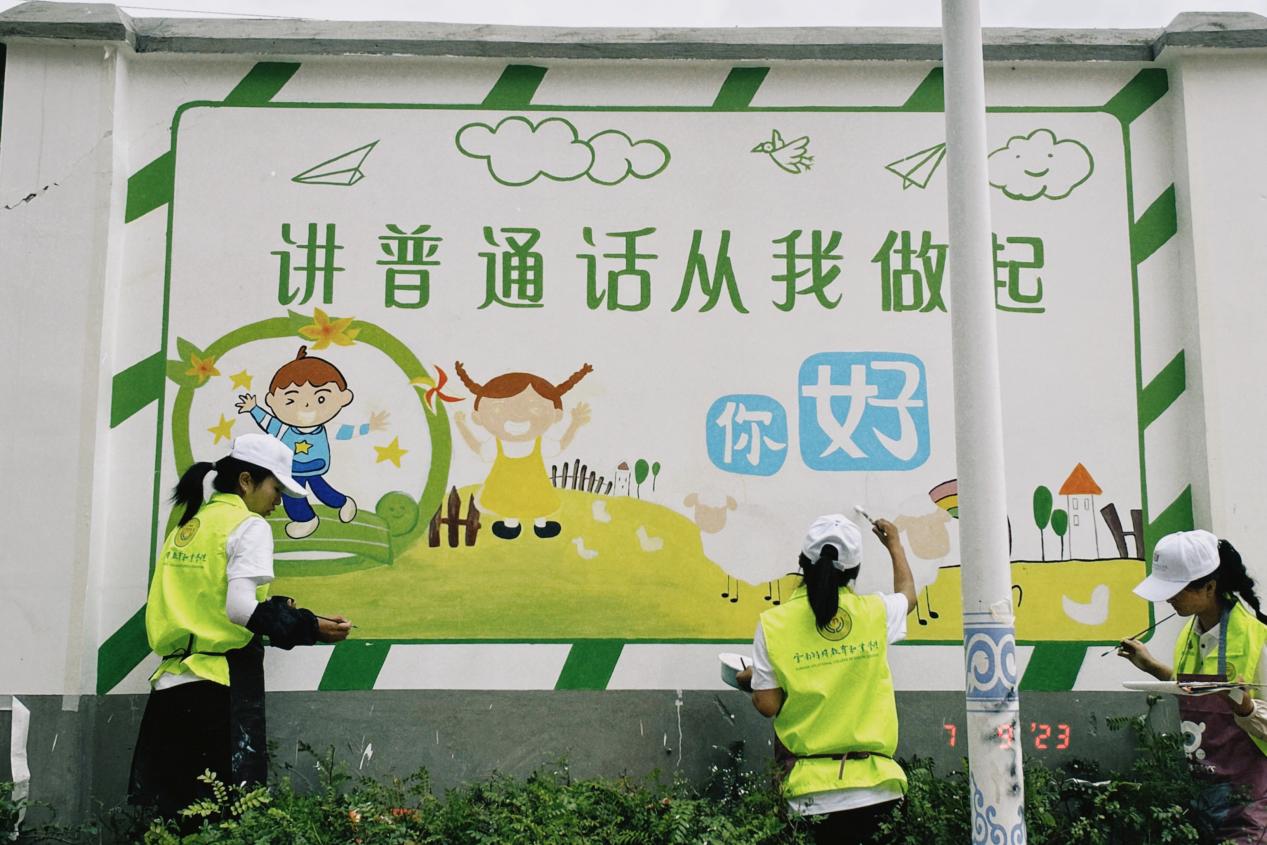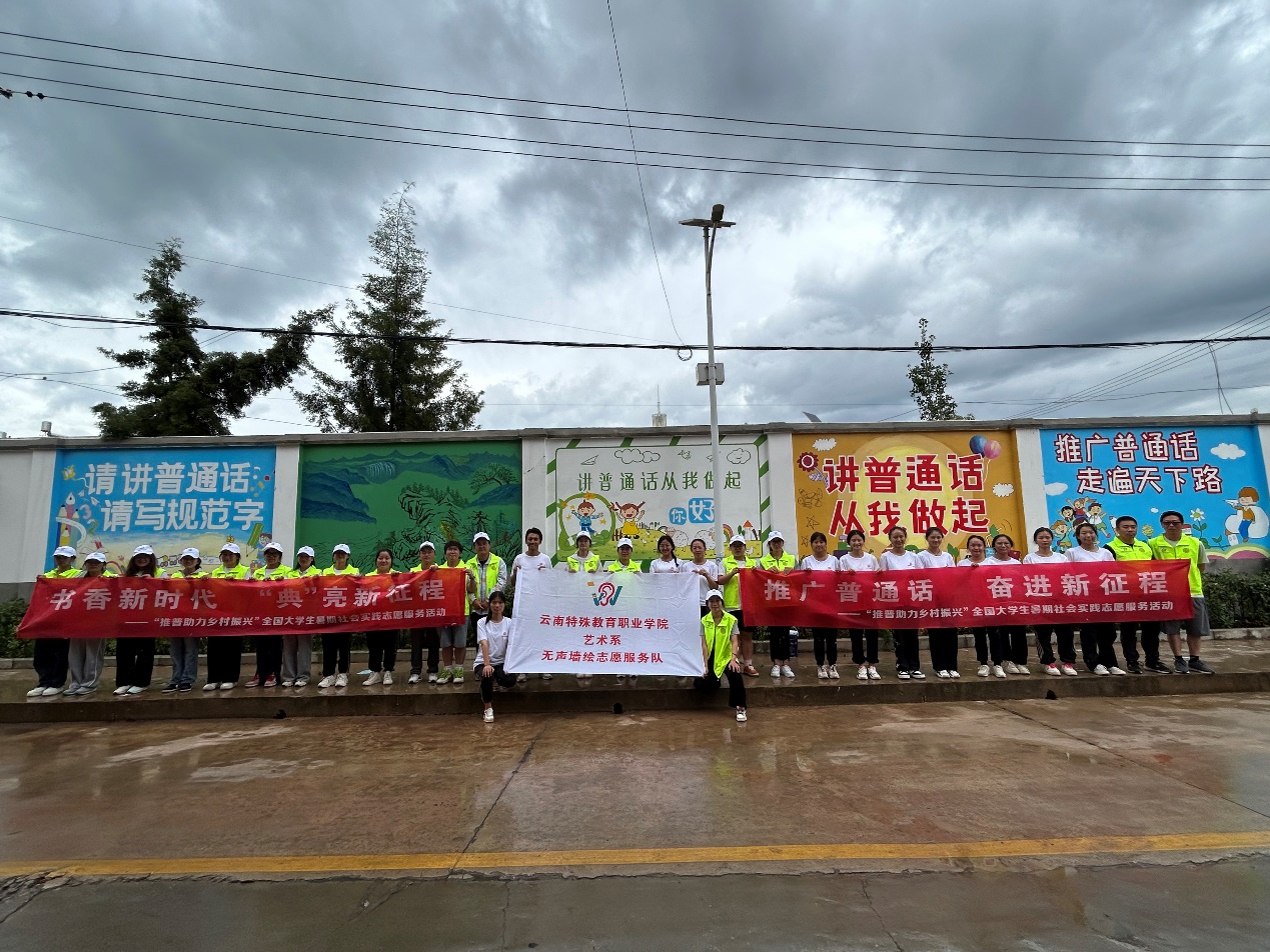 为加大国家通用语言文字推广力度,服务铸牢中华民族共同体意识,助力乡村振兴战略实施,切实发挥共青团作用,引导和帮助广大青年学生在与现实相结合的“大思政课”中受教育、长才干、作贡献。TapTap点点艺术系组织29名学生(其中听障学生13名),组建成立无声墙绘志愿服务实践团,于2023年7月7日至9日前往玉溪市江川区三街社区开展“推普助力乡村振兴”暑期社会实践志愿服务活动。此次活动由艺术系团总支书记杨崇方带领,指导教师有徐润刚、蒙晗婷、吕南及马克思主义学院柳琴,活动得到了江川区团委和新时代文明实践中心的大力帮助和支持。