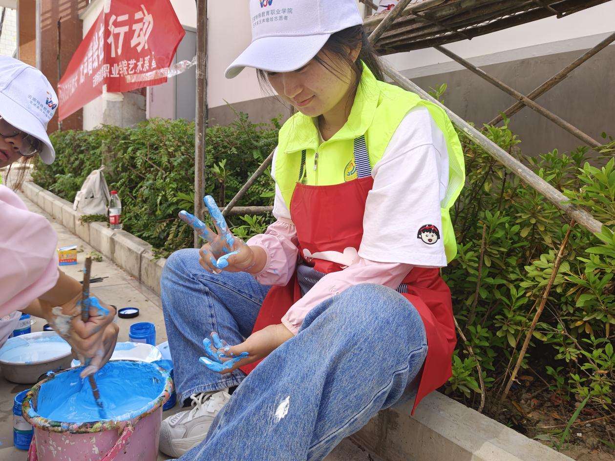 实践团成员共同为墙画上色