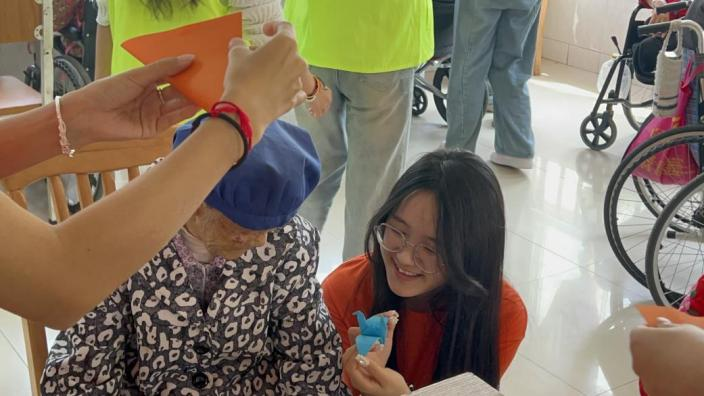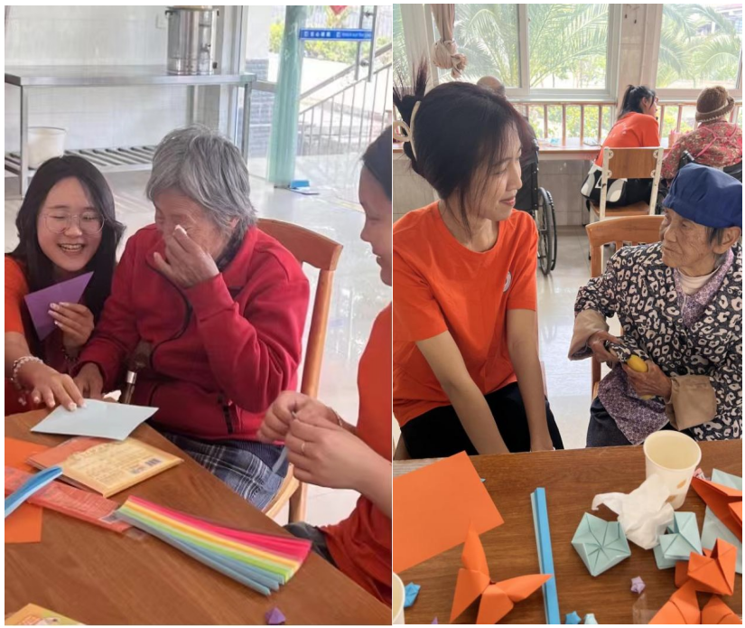 志愿者们陪老人们折纸谈心
