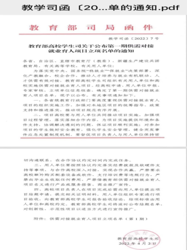 图为教育部高校学生司关于公布第一期供需对接就业育人项目立项名单的通知