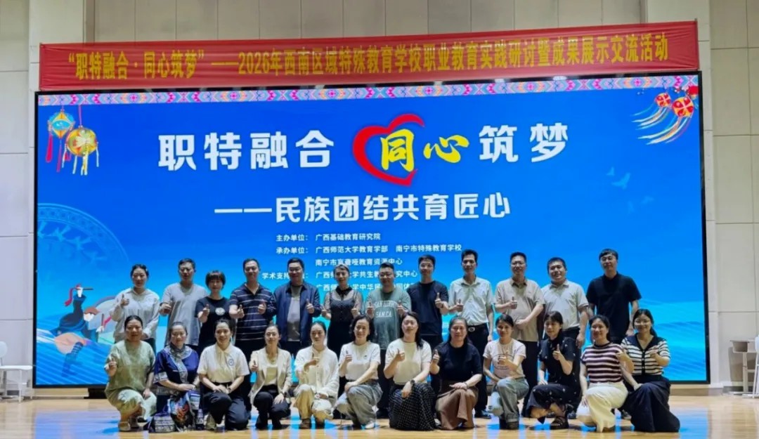 本次活动由广西基础教育研究院主办,广西师范大学教育学部、南宁市特殊教育学校等单位承办,聚焦“民族团结共育匠心”核心主题,汇聚西南地区多所特殊教育学校、高校专家、非遗传承人等参加,通过职教实操课堂展示、学生技能成果展、专题圆桌研讨等形式,搭建起跨区域特教职教交流协作的优质平台,为推动区域特殊教育职业教育高质量发展凝聚合力。