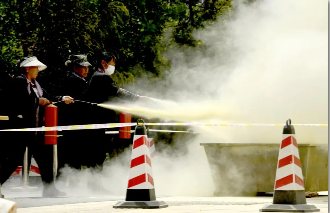 理论讲解环节,消防救援局的宣传员围绕消防安全常识、常见火灾类型及扑救方法展开系统教学,重点讲解消防栓、消防水带的规范操作,呼吸面具的正确佩戴、气密性检查与紧急撤离技巧,并详细演示干粉、水基、二氧化碳三类灭火器的适用场景与操作要领,强调提、拔、握、压四字实操口诀,让参训人员清晰掌握不同火情的处置方法与安全注意事项。
